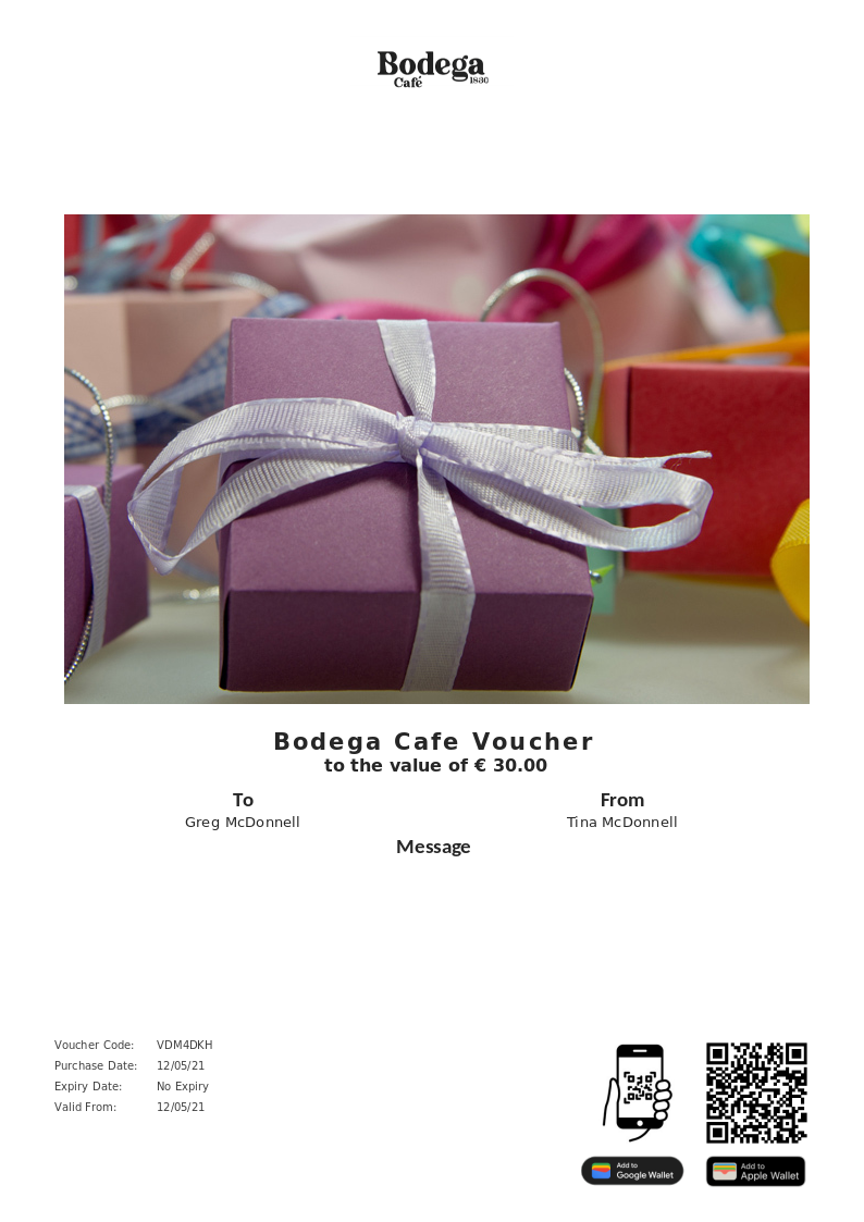 Bodega Cafe allows you to purchase instantly printable gift vouchers, special offers and tickets using the Voucher Connect platform.